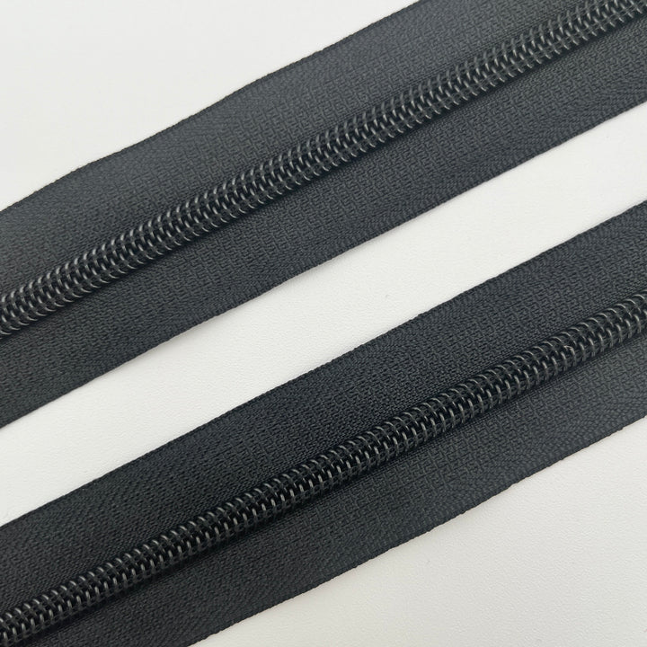 • #5 Matte Black Nylon Coil Zipper Tape: Featuring 1-1/4" width, this durable and smooth-operating zipper tape is perfect for a variety of applications, including apparel, bags, and accessories.